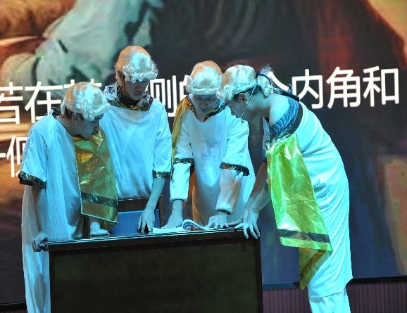 參加展演的16個節(jié)目分為課程實踐作品與文藝節(jié)目兩大類,來自10個院(系)的一百五十多位同學(xué)在舞臺上展示了他們探究數(shù)學(xué)啟蒙思想、對實際生活中建模的理解、對數(shù)學(xué)之美的發(fā)現(xiàn)。其中有根據(jù)數(shù)學(xué)家故事繪制的“數(shù)學(xué)漫畫”、有結(jié)合數(shù)學(xué)原理制作的“古代建橋黑科技之超強承重筷子橋”、有用Python編寫的函數(shù)動畫;舞臺劇《幾何原本》漫溯歷史長河、探索數(shù)學(xué)真諦,《王冠的秘密》《田忌賽馬》以夸張幽默的表演再現(xiàn)經(jīng)典數(shù)學(xué)故事;小品《數(shù)游長安》讓數(shù)學(xué)問題和文化旅游巧妙碰撞;街舞《數(shù)學(xué)圖像秀》盡顯青春風(fēng)采……。