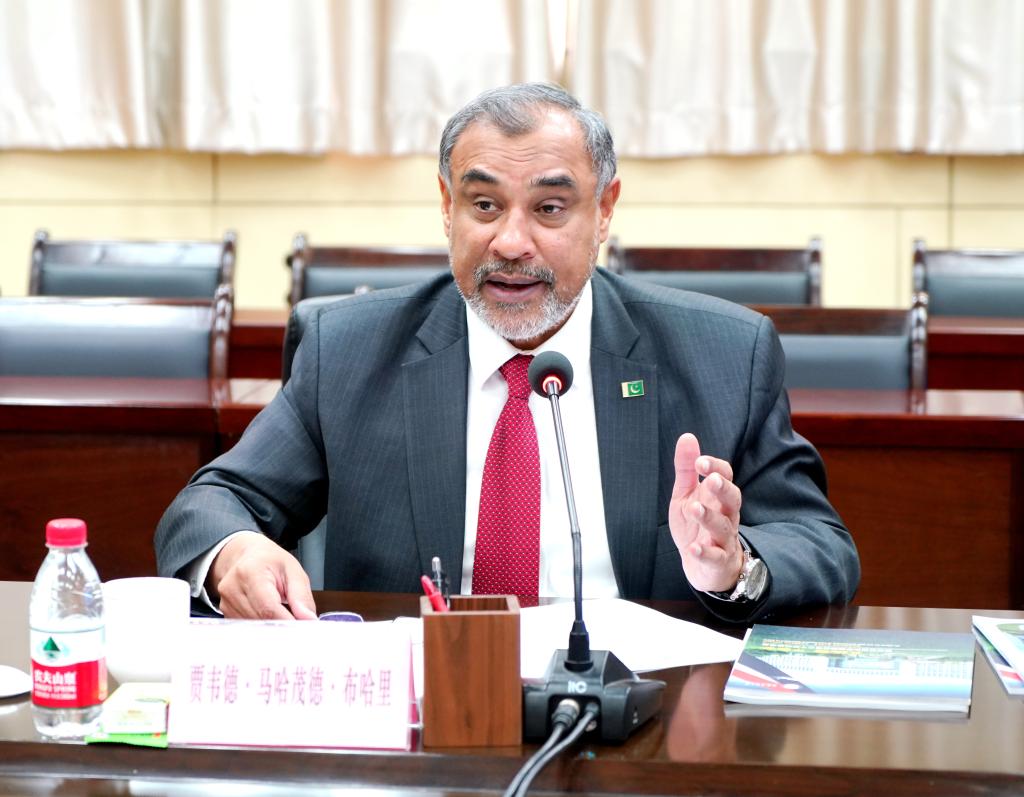 常江對布哈里一行來訪表示熱烈歡迎,并簡要介紹了學(xué)校發(fā)展歷史與辦學(xué)特色。他表示,巴基斯坦是習(xí)近平主席提出的共建“一帶一路”倡議最早參與國之一。巴基斯坦國立科技大學(xué)是巴基斯坦頂尖研究型大學(xué)。圍繞“一帶一路”倡議及中巴兩國合作,學(xué)校希望發(fā)揮自身特色,與巴基斯坦國立科技大學(xué)在能源研究、信息技術(shù)、基礎(chǔ)建設(shè)等領(lǐng)域開啟新合作。