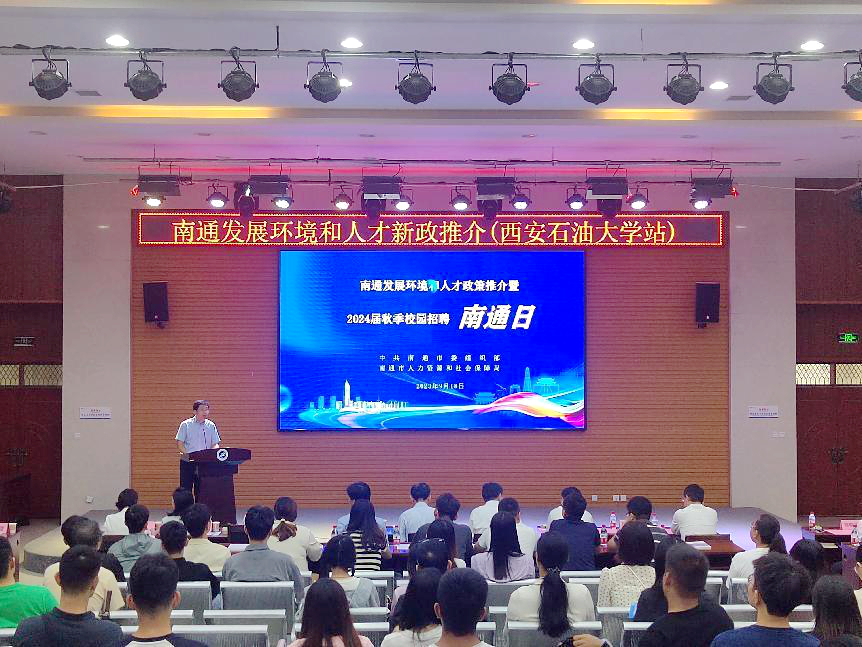 王一鳴代表南通市人力資源和社會保障局,向長期以來給予南通人才發(fā)展的學校領導、老師和學生表示衷心的感謝。他表示,西安石油大學是南通市在陜西省建立的第一個高校人才工作站,學校多年來充分發(fā)揮引才橋頭堡作用,全力搭建校地對接平臺,促成了西安地區(qū)高校與南通在高端紡織、生物醫(yī)藥等多個領域的深度合作。當前的南通正處在新一輪跨越發(fā)展的黃金機遇期,站上了千載難逢的絕佳“風口期”,南通比以往任何時候都更加需要人才、渴求人才,也比以往任何時候都更有條件吸引人才、成就人才。他真誠地希望大家繼續(xù)關心支持南通的發(fā)展,積極宣傳推介南通的人才政策和環(huán)境。真誠地希望更多的西安石油大學畢業(yè)生選擇南通、圓夢南通,共享時代紅利和發(fā)展機遇,讓青春之我與未來之城在新時代新征程中同頻共振、綻放華彩。
