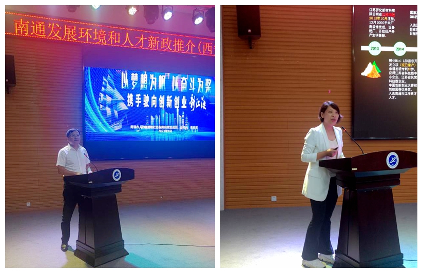 曹星暉代表人力資源和社會保障局作“南通發(fā)展環(huán)境和人才政策”推介,從產業(yè)提質擴量、交通樞紐建設、營商環(huán)境優(yōu)化、城市品質提升、生活品質提升等方面介紹了南通市經濟發(fā)展情況和人才新政。江蘇羅化新材料有限公司董事長羅雪方作為企業(yè)代表,結合自身創(chuàng)業(yè)經歷分享了南通市優(yōu)質的創(chuàng)業(yè)環(huán)境和引才留才舉措。