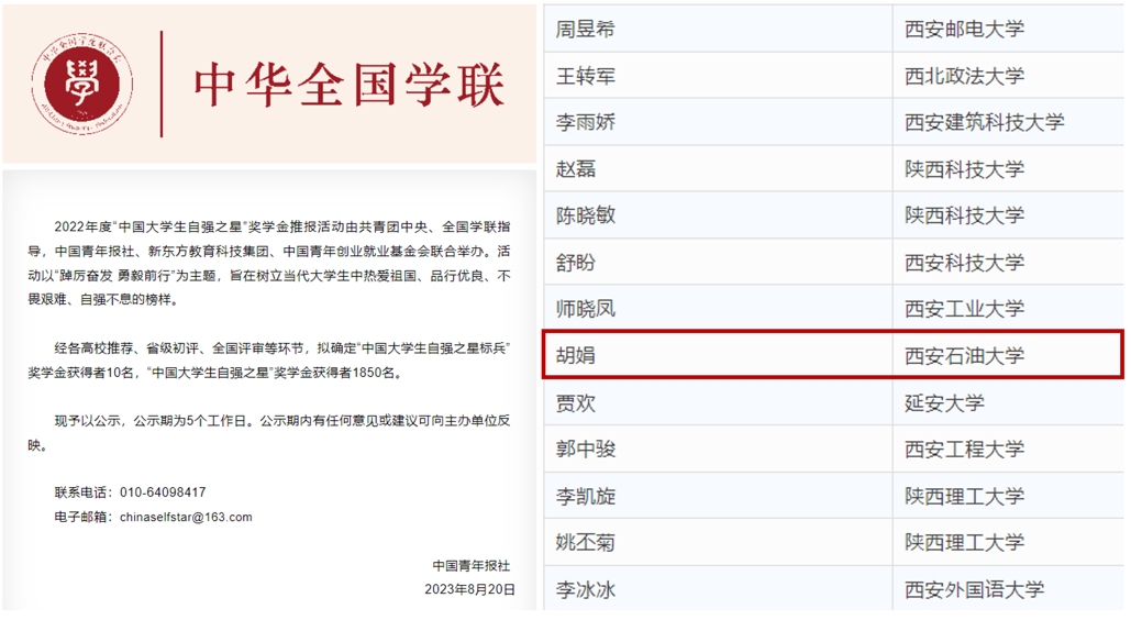 近日,由共青團中央、全國學聯(lián)指導,中國青年報社、新東方教育科技集團、中國青年創(chuàng)業(yè)就業(yè)基金會聯(lián)合開展的2022年度“中國大學生自強之星”尋訪活動結(jié)果揭曉。我校石油工程學院研2021級胡娟榮獲“中國大學生自強之星”和“陜西省大學生自強之星標兵”,石工(教改)2001班梁歡榮獲“陜西省大學生自強之星”。