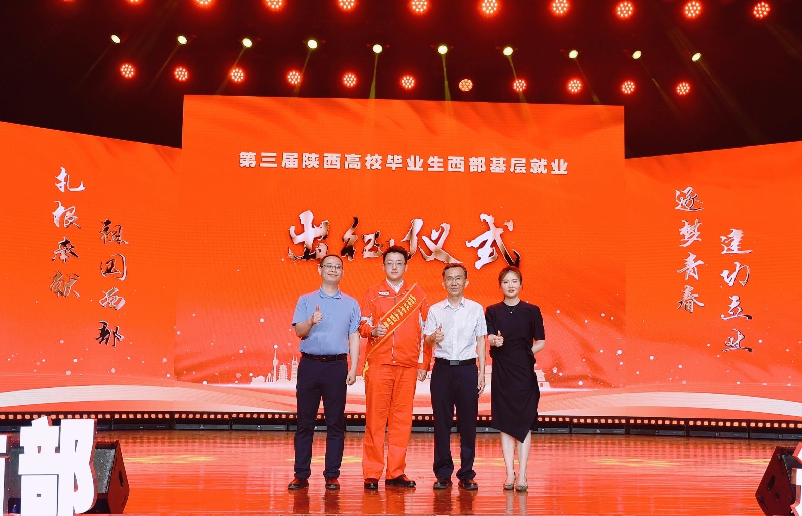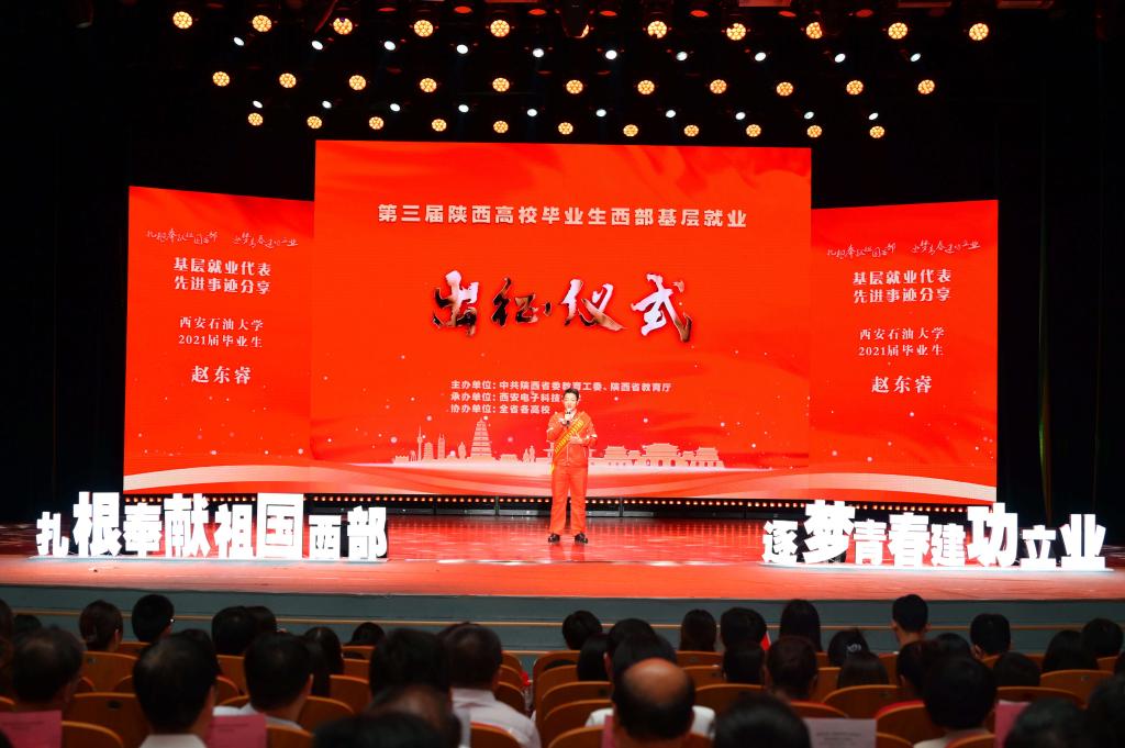 為積極響應(yīng)國家鼓勵畢業(yè)生到西部、到基層、到祖國最需要的地方建功立業(yè),引導(dǎo)畢業(yè)生將個人理想與國家發(fā)展需要緊密結(jié)合,著力發(fā)揮陜西服務(wù)“西部大開發(fā)”的人才優(yōu)勢,7月8日晚,第三屆陜西高校畢業(yè)生西部基層就業(yè)出征儀式在西安電子科技大學(xué)舉行。陜西省委教育工委書記劉建林為赴西部基層就業(yè)的畢業(yè)生代表們授旗,教育部學(xué)生服務(wù)與素質(zhì)發(fā)展中心黨委副書記、紀委書記、副主任楊大研和陜西省委教育工委副書記、省教育廳廳長王樹聲出席并講話。我校黨委副書記張木及石油工程學(xué)院2021屆碩士畢業(yè)生趙東睿受邀現(xiàn)場參加活動。