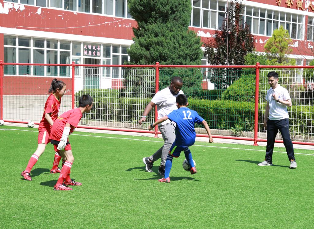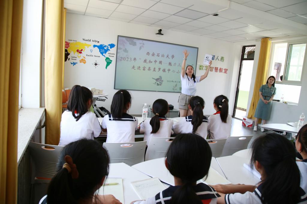 在直羅小學(xué),留學(xué)生們?yōu)樾W(xué)生們帶來(lái)了有趣生動(dòng)的英語(yǔ)口語(yǔ)課。實(shí)踐教學(xué)活動(dòng)是“感知中國(guó)”活動(dòng)重要組成部分,在互動(dòng)課堂上,小學(xué)生們與來(lái)自不同國(guó)家的留學(xué)生互動(dòng)交流,來(lái)自馬來(lái)西亞的詠翰分別用中文、英文、馬來(lái)西亞語(yǔ)給小學(xué)生們教了生日祝福歌,來(lái)自哈薩克斯坦的小云用圖畫、猜謎游戲?yàn)樾W(xué)生們上了一堂生動(dòng)活潑的英語(yǔ)課。有趣的英語(yǔ)課堂激發(fā)了小學(xué)生學(xué)習(xí)英語(yǔ)的熱情和濃厚的興趣,課堂氣氛熱烈,同學(xué)們發(fā)言踴躍,一節(jié)課下來(lái)小學(xué)生們意猶未盡。英語(yǔ)課堂外,是以“傳播快樂(lè)足球”為主題的足球互動(dòng)活動(dòng),留學(xué)生與小學(xué)生們開(kāi)展了一場(chǎng)足球友誼賽。場(chǎng)上,參賽隊(duì)員們齊心協(xié)力,奮勇拼搏。帶球、護(hù)球、傳球、射球,動(dòng)作嫻熟,拼勁十足。就這樣,初次來(lái)到直羅小學(xué)的留學(xué)生們感受到了當(dāng)?shù)氐娘L(fēng)土人情,并對(duì)接下來(lái)與孩子們的相遇充滿了期待?;顒?dòng)中,我校專程為直羅小學(xué)帶去了50本捐贈(zèng)圖書(shū)和5個(gè)嶄新足球。