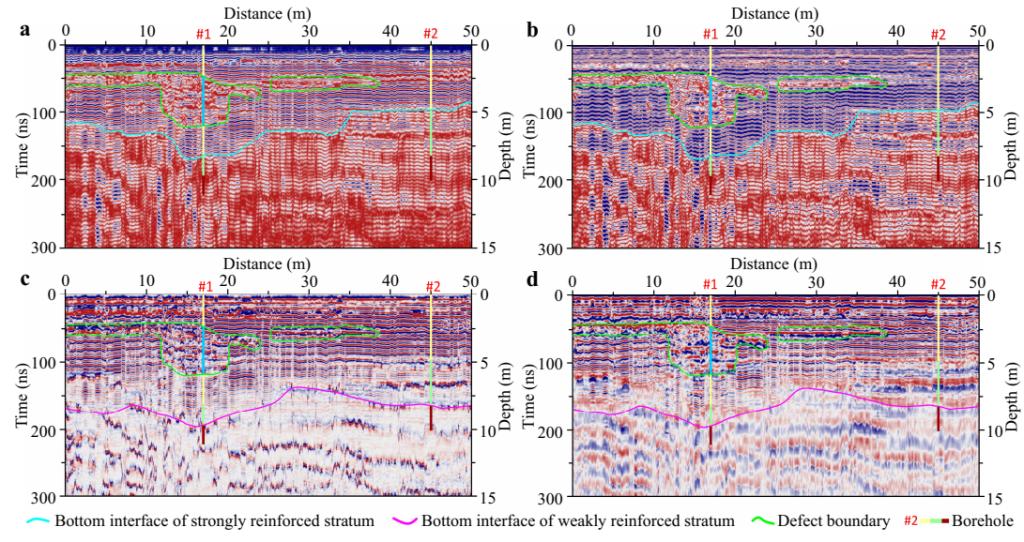 針對(duì)上述困難和挑戰(zhàn),研究團(tuán)隊(duì)歷時(shí)數(shù)年研究,通過理論推導(dǎo)、模型構(gòu)建、數(shù)值模擬、軟件開發(fā)和現(xiàn)場(chǎng)試驗(yàn)等手段,創(chuàng)新提出了將樁基缺陷檢測(cè)轉(zhuǎn)化為地基加固質(zhì)量評(píng)價(jià)的思想,構(gòu)建出樁群加固地基的地質(zhì)模型,揭示了群樁條件下地基的地質(zhì)雷達(dá)(Ground Penetrating Radar,GPR)響應(yīng)特征,研發(fā)出GPR多屬性信息提取軟件新技術(shù),并建立了樁基缺陷檢測(cè)及地基加固質(zhì)量評(píng)價(jià)的GPR技術(shù)體系。依托甘肅省安臨高速公路建設(shè)項(xiàng)目,研究團(tuán)隊(duì)開展了GPR技術(shù)在DCM樁缺陷檢測(cè)及地基加固質(zhì)量評(píng)價(jià)中的應(yīng)用實(shí)踐。研究結(jié)果表明,通過融合單道波形、多道剖面、GPR屬性和鉆孔等信息,可準(zhǔn)確識(shí)別出樁長和強(qiáng)/弱加固層、原生地層、缺陷地層的埋深及范圍等。該研究成果為軟土地基的DCM樁加固質(zhì)量評(píng)價(jià)提供了一種快速、高效和經(jīng)濟(jì)的技術(shù)解決方案,填補(bǔ)了樁群數(shù)量大、樁距小、密度高等情況下樁基缺陷高效檢測(cè)的技術(shù)空白。