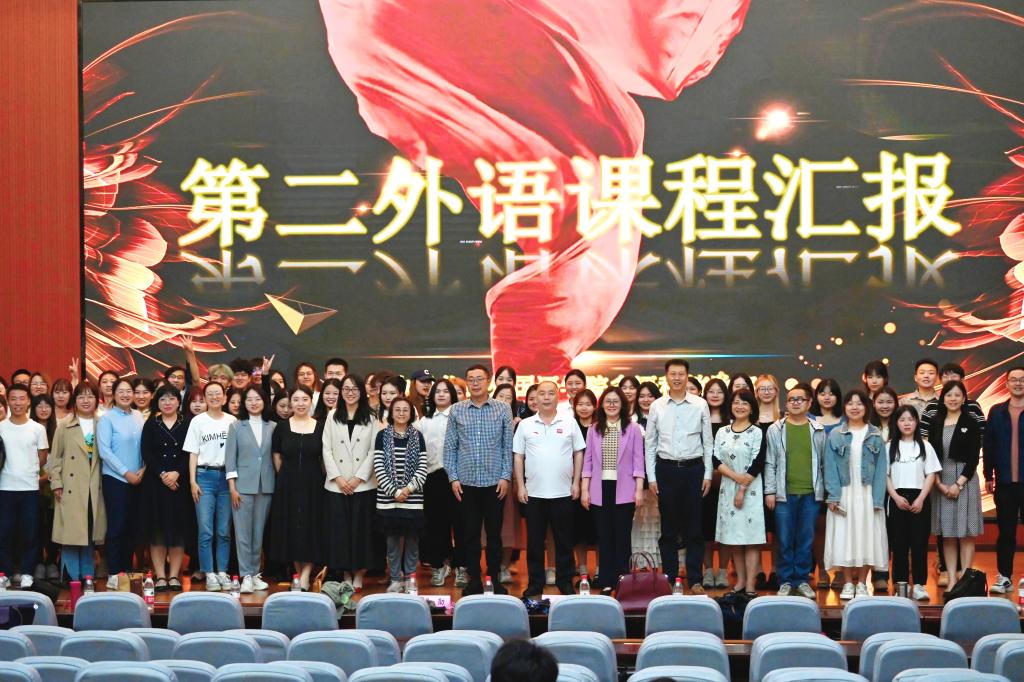 為探索實踐以培養(yǎng)英語+多語種復(fù)合型國際化人才為目標(biāo)的新思路,提高學(xué)生第二外語應(yīng)用能力,展現(xiàn)第二外語教學(xué)成效,5月31日下午,我?!暗诙庹Z”課程匯報演出在鄠邑校區(qū)弘石學(xué)術(shù)報告廳成功舉辦。副校長陳軍斌出席匯報活動。教務(wù)處負(fù)責(zé)人,外國語學(xué)院負(fù)責(zé)人、部分教師及300余名學(xué)生參加了活動。