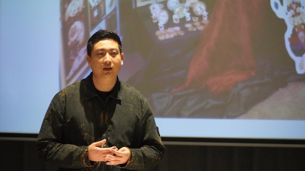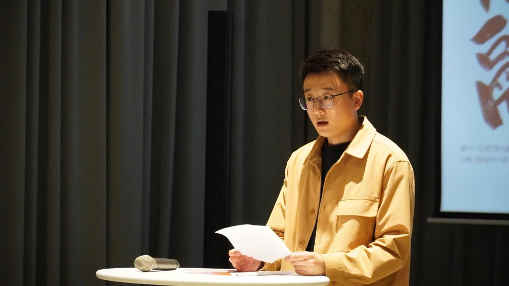 人文學(xué)院2023屆藝術(shù)碩士研究生畢中澤作為學(xué)生代表發(fā)言。他首先代表17位即將畢業(yè)的研究生感謝學(xué)校領(lǐng)導(dǎo)和相關(guān)職能部門提供的展示平臺,本次展覽是同學(xué)們在深入學(xué)習(xí)中國傳統(tǒng)文化、關(guān)注現(xiàn)實生活、探尋藝術(shù)規(guī)律的基礎(chǔ)上,將藝術(shù)與技術(shù)融合思考轉(zhuǎn)化為設(shè)計實踐的一次綜合嘗試,反映出同學(xué)們時刻關(guān)注社會、服務(wù)社會的創(chuàng)作初心。