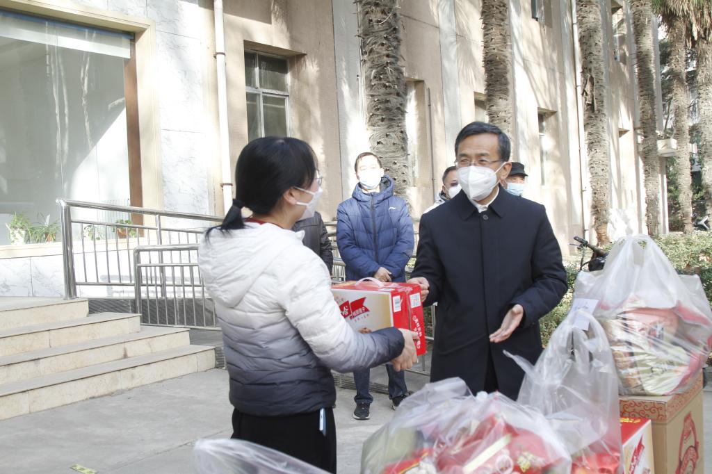 1月19日上午,在新春佳節(jié)來臨之際,校黨委副書記張木、副校長蘇文甫帶領(lǐng)工會全體同志分別在雁塔校區(qū)和鄠邑校區(qū)慰問了保衛(wèi)處、后勤處、校醫(yī)院以及假期值班堅守在一線工作崗位上的部分教職工,帶去了學(xué)校對他們的關(guān)懷和慰問。