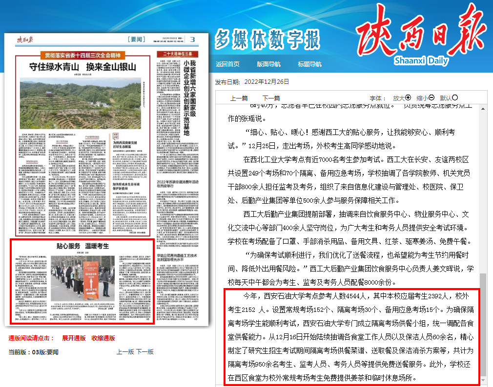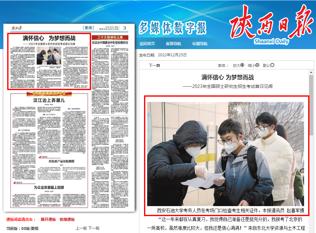 學(xué)校研究生招生考試得到了陜西日報(bào)、陜西廣播電視臺、“學(xué)習(xí)強(qiáng)國”陜西學(xué)習(xí)平臺、澎湃新聞、華商報(bào)、陜西省教育廳官微等省級主流媒體和上級部門的多次報(bào)道,其中,12月25日、26日,陜西日報(bào)兩次報(bào)道學(xué)校考務(wù)工作,取得了較好的社會反響。