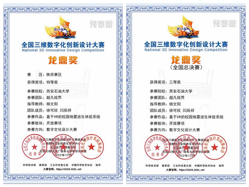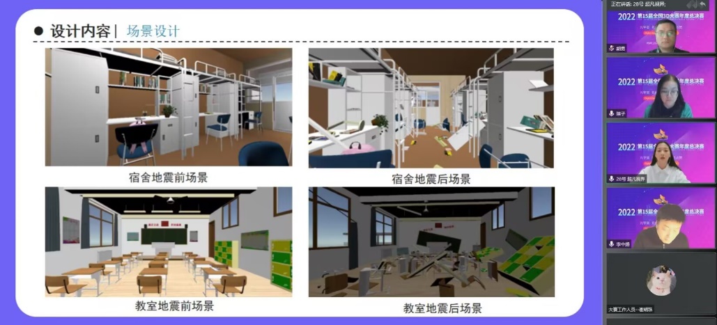 結(jié)合當前疫情防控形勢,全國總決賽采用了線上為主的方式進行,邀請百余位行業(yè)/院校/企業(yè)專家參與了總決賽作品的評審工作,評審主要考察設計創(chuàng)意性、技術(shù)應用創(chuàng)新性、工程實用性、美學、商業(yè)可開發(fā)價值、社會價值等多項因素。此次大賽開辟四類參賽作品類型:工業(yè)、文化、人居設計以及元宇宙創(chuàng)建大賽,參賽主題依據(jù)不同類型各有側(cè)重和特色。我校計算機學院學子的數(shù)字文化設計類作品《基于VR的校園地震逃生體驗系統(tǒng)》,以科普地震逃生知識和技能為背景,通過VR技術(shù)讓體驗者更為直觀生動的感受到地震發(fā)生時的情況,以新穎的方式增強學生面對地震突發(fā)時的應急能力,對地震應急救援有較好的應用價值。