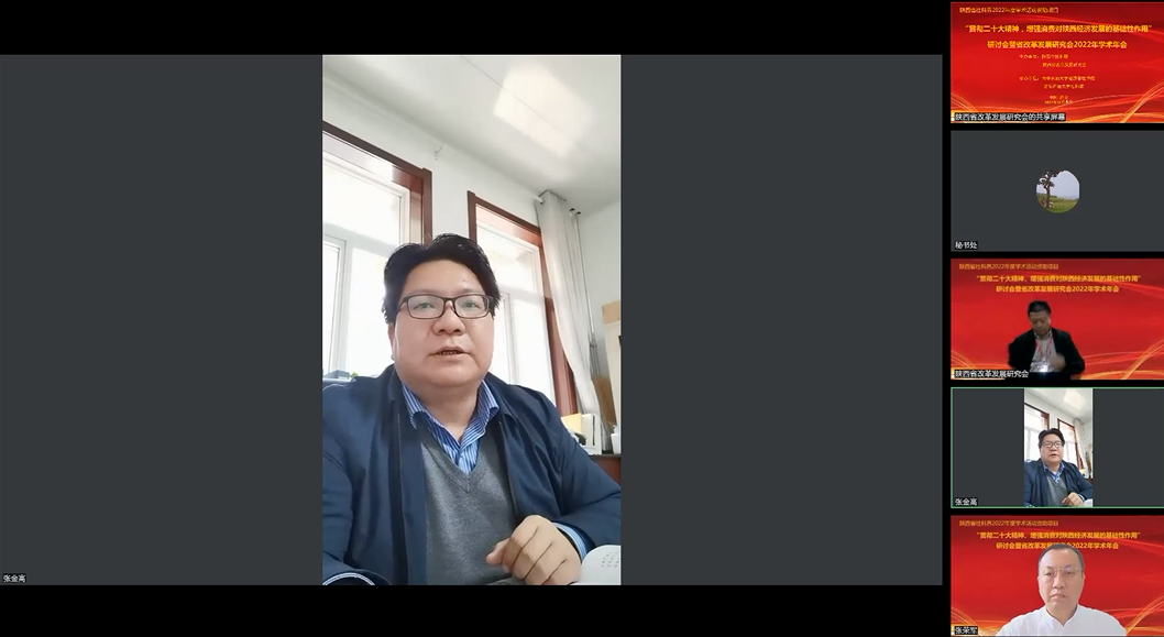 我校副校長(zhǎng)張榮軍、陜西省社會(huì)科學(xué)界聯(lián)合會(huì)學(xué)會(huì)部部長(zhǎng)張金高、陜西省改革發(fā)展研究會(huì)會(huì)長(zhǎng)曾昭寧出席此次會(huì)議,陜西省改革發(fā)展研究會(huì)專家顧問、會(huì)員,西安石油大學(xué)、西安交通大學(xué)、西北農(nóng)林科技大學(xué)、陜西師范大學(xué)、西安工程大學(xué)、西安財(cái)經(jīng)大學(xué)、安康學(xué)院等高校學(xué)者及中國(guó)石油、中航集團(tuán)等企業(yè)界人士共300余人線上線下同步參加了會(huì)議。此次會(huì)議分為開幕式、優(yōu)秀成果頒獎(jiǎng)、主旨演講三個(gè)環(huán)節(jié),開幕式由陜西省改革發(fā)展研究會(huì)副會(huì)長(zhǎng)張衛(wèi)平主持。