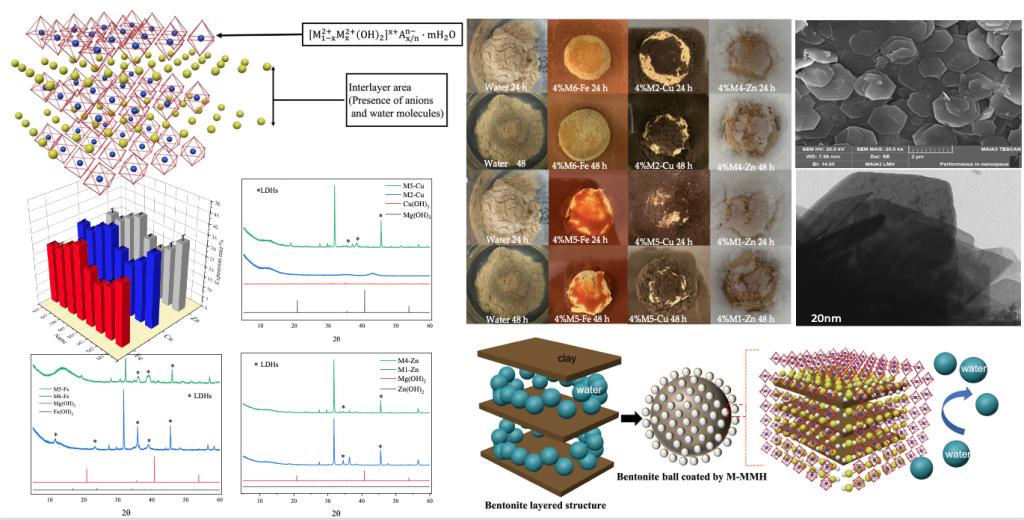 該插層聚合物仍存在許多不足,比如造漿能力不強(qiáng)和攜巖性差。為了解決這些問題,該課題組通過引入Cu、Fe、Zn等離子制備多元插層聚合物(M-MMH),評價了其抑制粘土分散的作用,并研究了其作為抗高溫鉆井液基漿組分的可能性,如圖3所示。