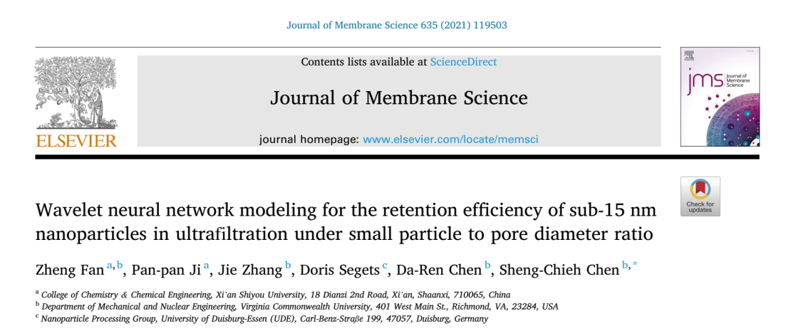 近日,我校化學(xué)化工學(xué)院范崢、黃風(fēng)林科研團(tuán)隊(duì)以范崢為第一作者、西安石油大學(xué)為第一單位在國(guó)際膜科學(xué)領(lǐng)域?qū)W術(shù)期刊《Journal of Membrane Science》(JCR、中科院分區(qū)雙一區(qū)TOP期刊,IF=10.53)上發(fā)表題為《Wavelet neural network modeling for the retention efficiency of sub-15 nm nanoparticles in ultrafiltration under small particle to pore diameter ratio》的高水平論文。