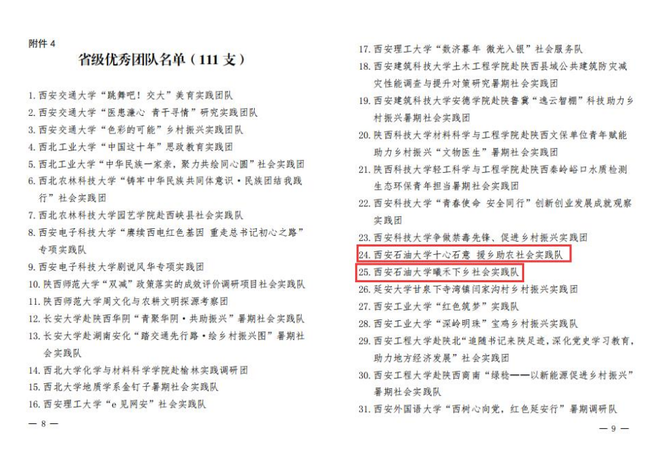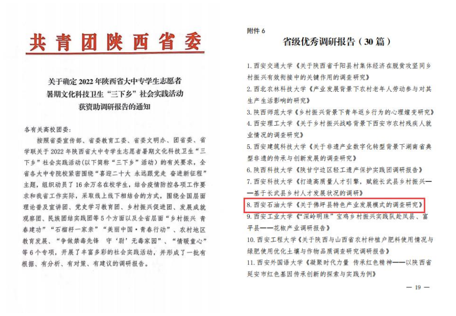近日,由陜西省委宣傳部、省委文明辦、省委教育工委、團(tuán)省委、省學(xué)聯(lián)等單位聯(lián)合組織開展的“2022年陜西省大中專學(xué)生志愿者暑期文化科技衛(wèi)生‘三下鄉(xiāng)’社會實(shí)踐活動”評選表彰結(jié)果揭曉,我校榮獲2022年“三下鄉(xiāng)”活動省級優(yōu)秀組織單位,地球科學(xué)與工程學(xué)院“十心石意援鄉(xiāng)助農(nóng)”社會實(shí)踐隊(duì),電子工程學(xué)院“曦禾下鄉(xiāng)”社會實(shí)踐隊(duì)被評為省級優(yōu)秀團(tuán)隊(duì)。王瑩、李政被評為省級先進(jìn)個(gè)人。地球科學(xué)與工程學(xué)院《關(guān)于佛坪縣特色產(chǎn)業(yè)發(fā)展模式的調(diào)查研究》調(diào)研報(bào)告獲團(tuán)省委專項(xiàng)資助。