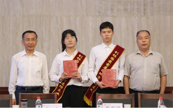 座談會后,張木和陳軍斌代表學校向畢業(yè)生代表贈送了書籍。