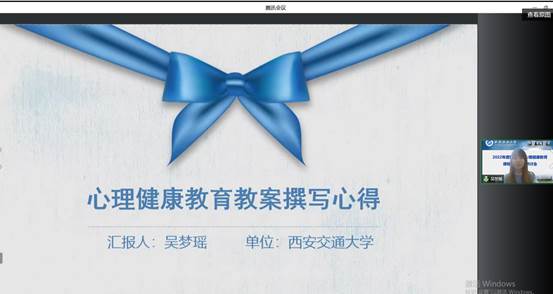 第三屆陜西高校心理健康教育教案評(píng)選一等獎(jiǎng)獲得者西安交通大學(xué)吳夢瑤、空軍軍醫(yī)大學(xué)2021年度“十佳優(yōu)秀教案”獲得者吳迪兩位老師結(jié)合各自的獲獎(jiǎng)教案分享了《心理健康教育教案撰寫心得》以及《教案書寫的心得與體會(huì)》,他們優(yōu)秀的教案讓參會(huì)者們看到了一線老師對(duì)待教學(xué)的用心、精心、恒心。
