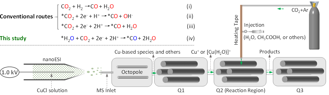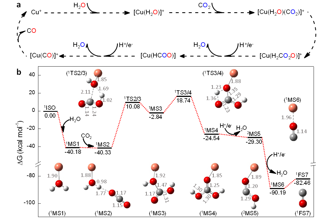 按照傳統(tǒng)觀點,二氧化碳還原轉(zhuǎn)化為一氧化碳中的O原子來自二氧化碳。該研究中,科研人員發(fā)現(xiàn)還原反應生成一氧化碳中的O原子來自反應體系催化劑表面的配位水分子,而非二氧化碳本身。該結論不僅適用于質(zhì)在線反應過程,也適用于實際二氧化碳的電催化還原反應和工業(yè)化水煤氣逆反應過程,說明該發(fā)現(xiàn)具有一定的普適性。同時發(fā)現(xiàn)相比于金屬催化劑Cu+,當[Cu(H2O)]+作為催化劑時,二氧化碳還原為一氧化碳的反應效率可提高兩個數(shù)量級。為了深入探究該反應過程,科研人員通過改造質(zhì)譜儀對反應中間體的捕獲、同位素對比實驗和密度泛函理論的計算,詳細闡述了二氧化碳在[Cu(H2O)]+催化作用下生成一氧化碳的機制。該工作不僅為深入闡述二氧化碳還原機理提供了方法學基礎,也為詳細了解水在二氧化碳還原過程中的作用提供了著眼點。