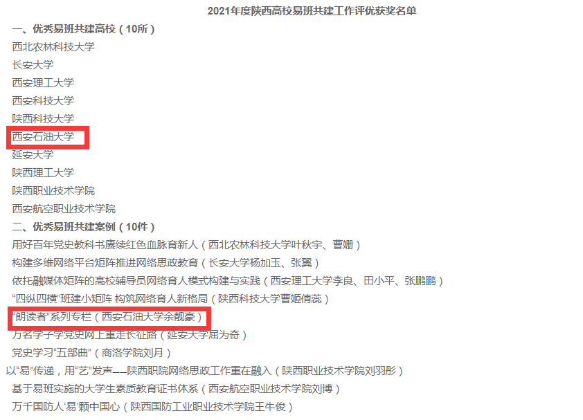 日前,陜西省高校易班發(fā)展中心組織開展2021年度全省易班共建高校評選活動,對易班建設(shè)先進集體和優(yōu)秀個人進行表彰。我校被評為“優(yōu)秀易班共建高?!?,由我校申報的《朗讀者》系列專欄被評為“優(yōu)秀易班共建案例”,學(xué)生工作部(處)余靚豪同志被評為“優(yōu)秀易班指導(dǎo)教師”,機械工程學(xué)院輔導(dǎo)員馬舒宇老師被評為“優(yōu)秀易班輔導(dǎo)員”,機械工程學(xué)院機械1904班仲衡同學(xué)被評為“優(yōu)秀易班工作站站長”。