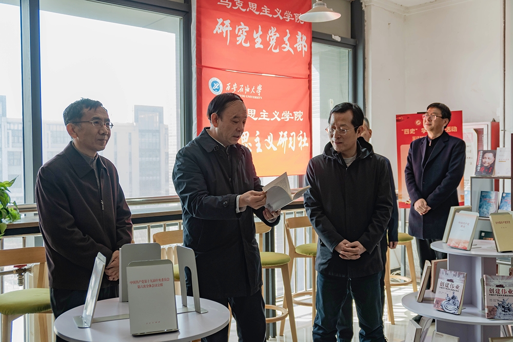 在鄠邑校區(qū),指導(dǎo)組一行參觀了鐵人紀(jì)念館、校史館、馬列書屋“黨史學(xué)習(xí)教育專區(qū)”、實(shí)習(xí)認(rèn)知園、省級石油石化虛擬仿真實(shí)驗(yàn)教學(xué)示范中心;現(xiàn)場觀摩了我校期刊中心主任郭崗彥講授的“鐵人精神”通識教育課《破解鐵人之謎,解析精神密碼》第一課堂教學(xué)演示,馬克思主義學(xué)院教師張莉、學(xué)生王婉菲等開展的師生聯(lián)學(xué)《從鐵人精神中汲取奮進(jìn)力量》第二課堂教學(xué)演示,以及工程訓(xùn)練中心綜合實(shí)訓(xùn)室開展的VR現(xiàn)場教學(xué)演示;實(shí)地察看了“我為師生辦實(shí)事”項目進(jìn)展情況,了解學(xué)校在虛擬仿真實(shí)驗(yàn)教學(xué)與實(shí)踐教學(xué)、體驗(yàn)教學(xué)有機(jī)融合方面作出的互聯(lián)網(wǎng)下教育教學(xué)創(chuàng)新探索成效。在走訪黨史學(xué)習(xí)教育專區(qū)“馬列書屋”時,指導(dǎo)組與我校師生還就基層師生黨支部黨史學(xué)習(xí)教育開展情況作了現(xiàn)場交流。