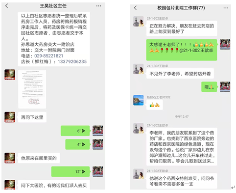 該樓樓長(zhǎng)李建偉老師看到信息后立馬聯(lián)系校醫(yī)院,在得知校醫(yī)院沒有該藥物后又和怡康、眾信、孫思邈等六七家藥店打電話咨詢,還是都沒有該藥品,于是聯(lián)系長(zhǎng)延堡救治組,獲得交大一附院、省康復(fù)醫(yī)院、五二一醫(yī)院等幾家醫(yī)院聯(lián)系方式,仍未能得到藥品的情況下,李老師在石油大學(xué)北院包片工作群中發(fā)出求助信息。北院包片負(fù)責(zé)人、各樓長(zhǎng)、單元長(zhǎng)、社區(qū)主任、校醫(yī)院等各位老師積極行動(dòng)起來(lái),每個(gè)人都發(fā)揮自己的各種渠道力量進(jìn)行愛心求助。最終北院21號(hào)樓單元長(zhǎng)王歆卓老師聯(lián)系到蓮湖區(qū)和碑林區(qū)防疫保障組的朋友鄭海龍老師,鄭老師先是跑到胃癌老人做手術(shù)的西京醫(yī)院和老人之前買過(guò)藥的藥店,在被告知都沒有該藥的情況下,他聯(lián)系到了該藥在西安的代理商,最終在東郊浐灞買到了該藥,然后又穿越整個(gè)西安以最快的速度送到石油大學(xué)社區(qū)北院,解決了燃眉之急。