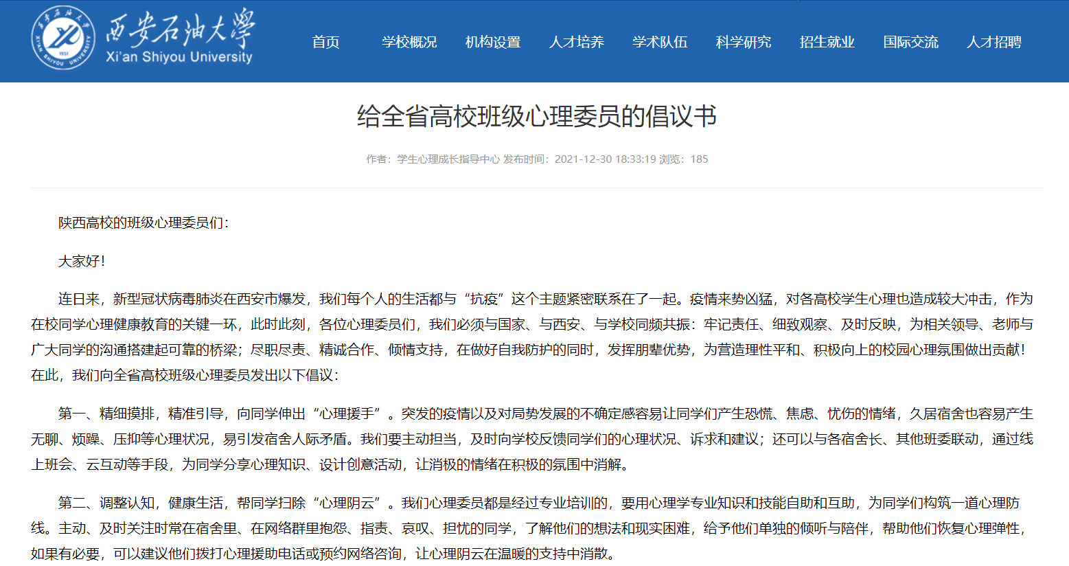 自12月16日學校黨委安排部署疫情防控工作以來,黨委學生工作部、研究生工作部密切聯(lián)動,各院(系)黨委(總支)積極配合,迅速啟動學生工作干部24小時在崗、鄠邑校區(qū)每周輪值等工作制度,確保一線工作力量充足,全方位有序做好思想教育引導、政策法律宣傳、衛(wèi)生防疫知識學習等工作。