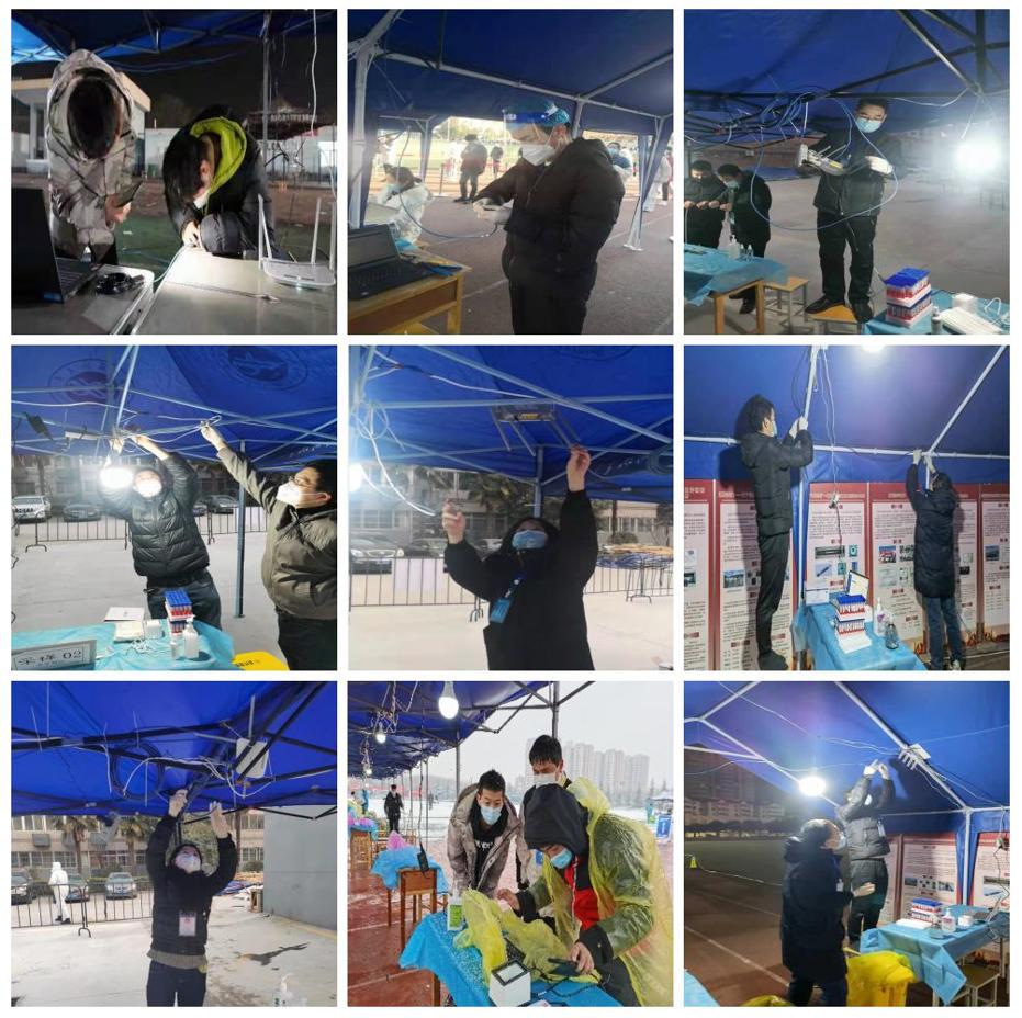 在每次全員核酸檢測(cè)前,都有一批忙碌的身影,在寒冬里手持網(wǎng)線鉗、剝線器、測(cè)線儀等工具,在“大白”上崗之前,測(cè)網(wǎng)線、調(diào)試路由器,提前為當(dāng)天的核酸檢測(cè)做準(zhǔn)備。在核酸檢測(cè)開(kāi)始后,他們蹲點(diǎn)旁站,堅(jiān)守現(xiàn)場(chǎng)直到當(dāng)天的核酸檢測(cè)順利結(jié)束?!鞍崖酚善麟娫春碗娫床灏迥媚z帶再粘一圈”“這根網(wǎng)線接頭再重新做個(gè)新的”“把所有的筆記本再測(cè)試一遍”。為了保障全員核酸順利進(jìn)行,他們提前到崗,一遍一遍地檢查,一次一次地測(cè)試,竭盡所能,盡全力排除隱患點(diǎn),確保核酸檢測(cè)場(chǎng)地網(wǎng)絡(luò)通暢?!斑@幾天網(wǎng)絡(luò)保障還比較順利,雖然很苦、很累,但核酸檢測(cè)很順利,我們做的一切都很值得”信息中心技術(shù)人員趙駿說(shuō)。從1215日開(kāi)始,趙駿同志一直堅(jiān)守鄠邑校區(qū),經(jīng)常冒著風(fēng)雪、加班到凌晨,為鄠邑校區(qū)全員核酸檢測(cè)提供網(wǎng)絡(luò)保障。