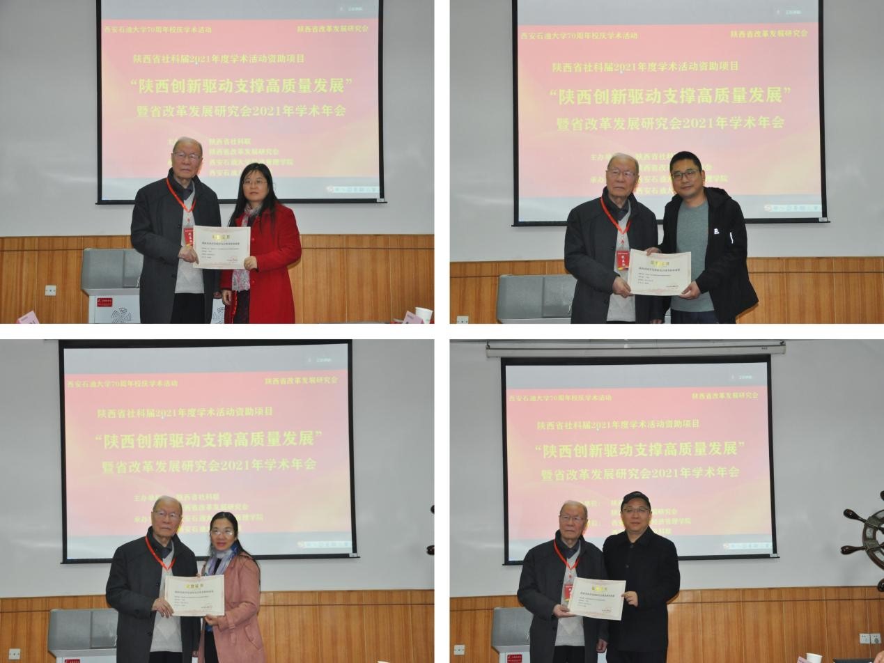享受國務院特殊津貼專家、陜西省有突出貢獻專家、陜西經(jīng)貿(mào)學院原院長、西安財經(jīng)大學樊光鼎教授對陜西省改革發(fā)展研究會慶祝建黨100周年優(yōu)秀科研成果評獎活動進行了介紹,并宣讀獲獎文件,與獲獎代表合影留念。