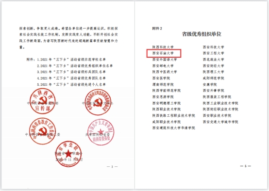 2021年暑期,由校團(tuán)委、學(xué)工部、研工部、宣傳部、教務(wù)處共同主辦,在疫情防控常態(tài)化形勢下,組織開展了“永遠(yuǎn)跟黨走 奮進(jìn)新時代”為主題的暑期“三下鄉(xiāng)”社會實(shí)踐活動,圍繞“回首百年奮斗路·青年接力新征程”“提升文明素養(yǎng)·助力全運(yùn)盛會”“防范毒品濫用·共享健康人生”“萬名學(xué)子扶千村”“擔(dān)當(dāng)時代責(zé)任·書寫事業(yè)華章”“相約石大·勵志起航”“天南海北石油人”“青春助力鄉(xiāng)村文化振興”“守護(hù)綠色家園·共建美麗陜西”等專題,立項(xiàng)組建64支社會實(shí)踐團(tuán)隊(duì),1500余人分別奔赴6個省、11個市、26個區(qū)縣開展社會實(shí)踐活動,在市級以上宣傳平臺上累計發(fā)布稿件23篇,新增社會實(shí)踐基地4個,撰寫調(diào)研報告、實(shí)踐心得等1300余篇,在學(xué)術(shù)期刊發(fā)表文章2篇。