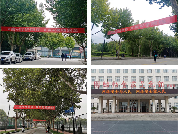安全周期間,學(xué)校在雁塔校區(qū)和鄠邑校區(qū)主干道懸掛了網(wǎng)絡(luò)安全宣傳周宣傳條幅,在LED大屏上輪播宣傳標(biāo)語(yǔ),并在門戶網(wǎng)站添加了網(wǎng)絡(luò)安全宣傳周宣傳大圖,加強(qiáng)網(wǎng)絡(luò)安全宣傳力度,營(yíng)造網(wǎng)絡(luò)安全宣傳教育氛圍。