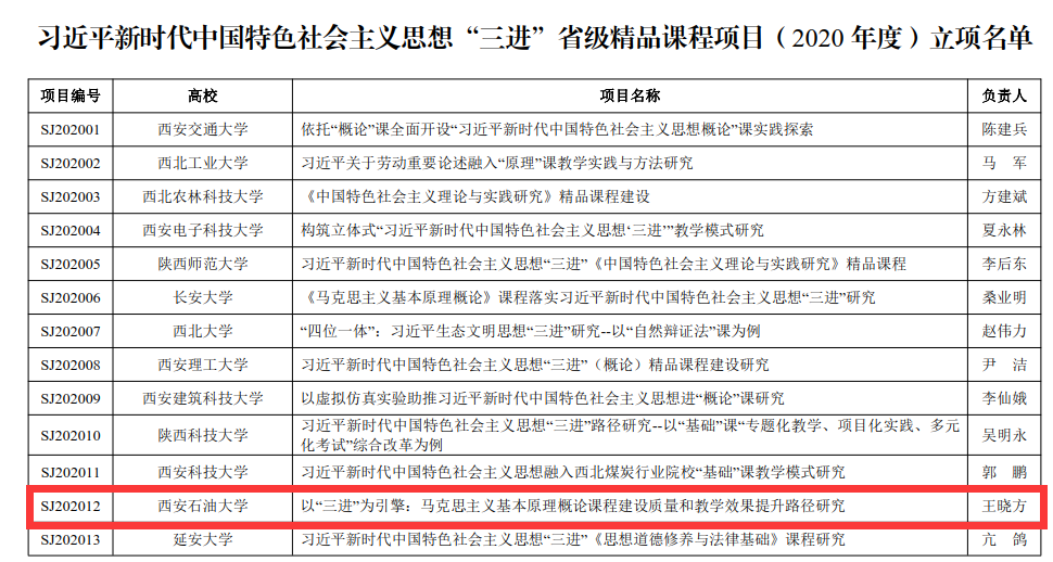 近日,省委教育工委發(fā)布了《中共陜西省委教育工委關(guān)于習(xí)近平新時(shí)代中國特色社會(huì)主義思想“三進(jìn)”省級(jí)精品課程項(xiàng)目(2020 年度)立項(xiàng)的通知》,全省共有25項(xiàng)課程項(xiàng)目予以立項(xiàng)。我校馬克思主義學(xué)院王曉方教授申報(bào)的《以“三進(jìn)”為引擎:馬克思主義基本原理概論課程建設(shè)質(zhì)量和教學(xué)效果提升路徑研究》入選立項(xiàng)名單。