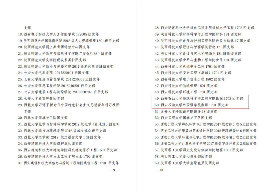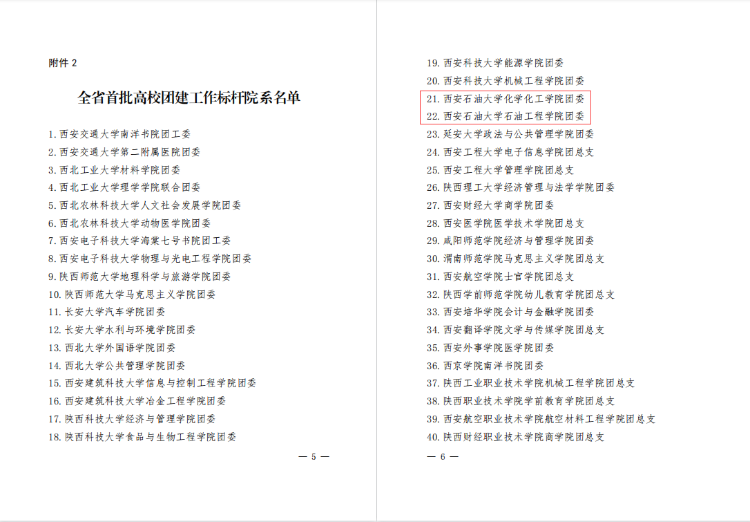 近日,共青團(tuán)陜西省委、中共陜西省委教育工委公布了《關(guān)于全省首批新時代高校團(tuán)建示范創(chuàng)建結(jié)果的通報》,我校石油工程學(xué)院團(tuán)委、化學(xué)化工學(xué)院團(tuán)委通過“全省高校團(tuán)建標(biāo)桿院系”驗收,地球科學(xué)與工程學(xué)院勘探1703團(tuán)支部、外國語學(xué)院翻譯1701團(tuán)支部通過“全省高校團(tuán)建樣板支部”驗收。