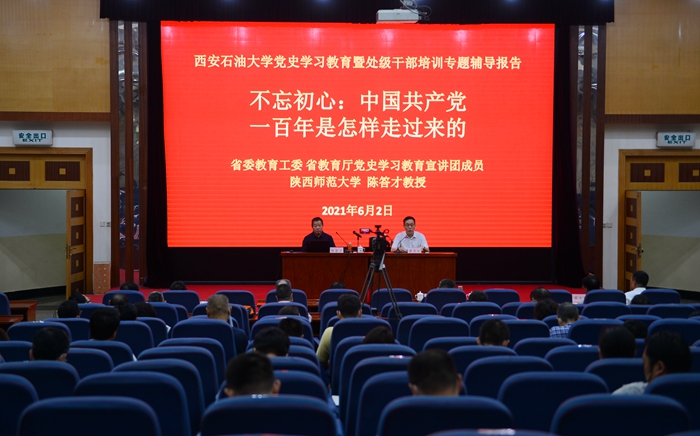 根據(jù)省委教育工委、省教育廳統(tǒng)一部署,結(jié)合學校年度干部培訓工作安排,6月2日上午,省委教育工委省教育廳宣講團走進我校,開展黨史學習教育暨處級干部培訓專題輔導報告會。宣講團成員、陜西師范大學陳答才教授以《不忘初心:中國共產(chǎn)黨一百年是怎樣走過來的》為題,在雁塔校區(qū)學術(shù)報告廳作報告。校黨政領(lǐng)導李延平、張木、陳軍斌、李華、蘇文甫、程永清、樊曉民等出席報告會。報告會由校黨史學習教育領(lǐng)導小組副組長、校黨委副書記雷西合主持。