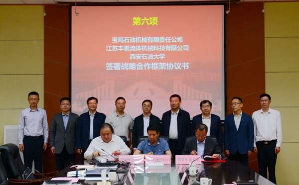 會(huì)上,寶雞石油機(jī)械有限責(zé)任公司副總經(jīng)理張斌、江蘇豐泰流體機(jī)械科技有限公司董事長侯曉東、我校副校長張榮軍分別代表校企政三方簽署了戰(zhàn)略合作協(xié)議書,我校材料科學(xué)與工程學(xué)院院長張驍勇、江蘇蓮源機(jī)械制造有限公司副總經(jīng)理陳玉洪分別代表校企雙方簽署了技術(shù)服務(wù)合同。政企校三方科技部門、我校相關(guān)院系負(fù)責(zé)人就三方今后在石油機(jī)械領(lǐng)域科研合作、人才培養(yǎng)等方面的合作進(jìn)行了深入探討。