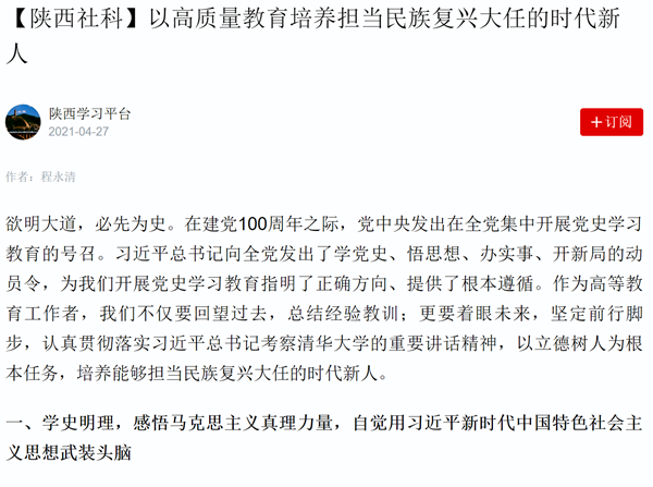4月27日,“學(xué)習(xí)強(qiáng)國(guó)”陜西學(xué)習(xí)平臺(tái)刊發(fā)我校程永清副校長(zhǎng)《以高質(zhì)量教育培養(yǎng)擔(dān)當(dāng)民族復(fù)興大任的時(shí)代新人》的文章,文章以學(xué)史明理,感悟馬克思主義真理力量,自覺(jué)用習(xí)近平新時(shí)代中國(guó)特色社會(huì)主義思想武裝頭腦;學(xué)史增信,堅(jiān)定共產(chǎn)主義信仰,發(fā)揮中國(guó)特色社會(huì)主義制度優(yōu)勢(shì),始終做到“兩個(gè)維護(hù)”;學(xué)史崇德,堅(jiān)持教書(shū)育人,傳播和弘揚(yáng)社會(huì)主義核心價(jià)值觀;學(xué)史力行,深化人才培養(yǎng)模式改革,推動(dòng)高等教育高質(zhì)量發(fā)展等四個(gè)方面進(jìn)行闡述。