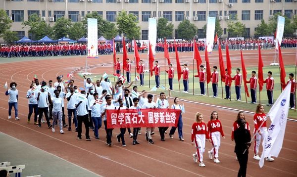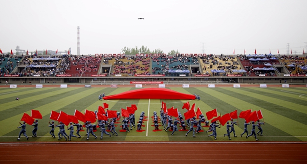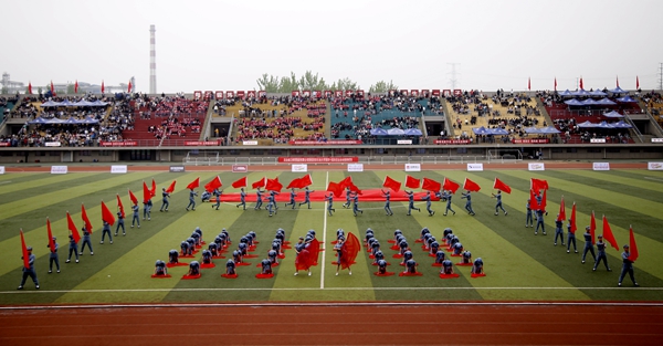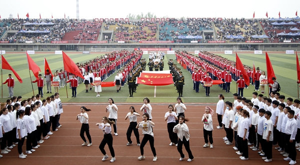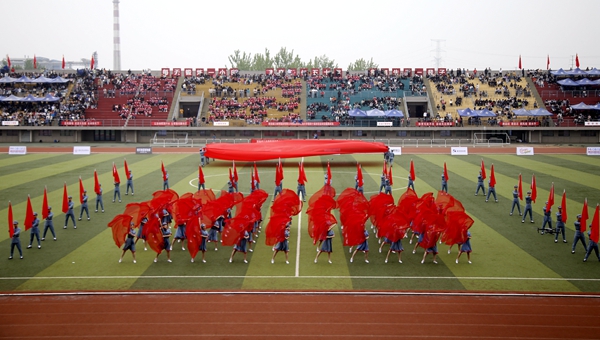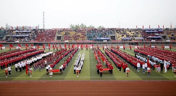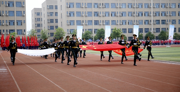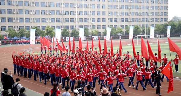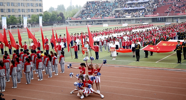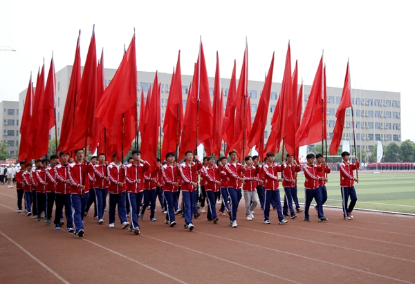 副校長、校體育運動委員會主任陳軍斌致開幕辭。他首先代表學(xué)校向運動會的開幕致以熱烈祝賀,向為本次運動會付出辛勤勞動的教職員工和同學(xué)們表示衷心的感謝。他談到,長期以來,我校高度重視體育工作,始終堅持“以人為本,健康第一”的體育教育思想,全面落實“健康教育、終身體育”的體育教學(xué)理念,充分發(fā)揮體育在學(xué)生成長成才和全面發(fā)展中的重要作用,營造了良好的校園體育活動氛圍。在過去的兩年里,學(xué)校各項體育競賽活動蓬勃開展,我校學(xué)子在眾多體育賽事中取得了優(yōu)異成績,為學(xué)校贏得了榮譽。他希望望全體運動員遵守比賽規(guī)則,服從裁判,奮力拼搏,賽出水平,賽出風(fēng)格,盡情體驗“更快、更高、更強”的奧運精神;全體裁判員在賽場上客觀公正,嚴(yán)格執(zhí)法;希望全體工作人員積極工作,熱情服務(wù),保證運動會順利舉行。