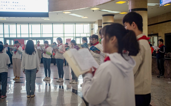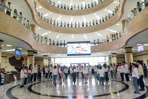 近200名師生戴著紅領(lǐng)巾一起朗誦了《為學(xué)之道》、《沁園春·長沙》、《你是人間四月天》和《輝煌明天》四首詩歌?!稙閷W(xué)之道》強調(diào)了博學(xué)、審問、慎思、明辨和篤行,同學(xué)們明白了學(xué)習(xí)重在方法,貴在堅持?!肚邎@春·長沙》抒發(fā)了革命青年對國家命運的感慨,蔑視反動統(tǒng)治者、改造舊中國的豪情壯志,同學(xué)們感受到以天下為己任的家國情懷?!赌闶侨碎g四月天》以景喻情,激發(fā)了同學(xué)們對生活的期待?!遁x煌明天》表達了學(xué)校支持國家發(fā)展、培育青年學(xué)子獻身石油的情懷和學(xué)校未來發(fā)展的美好愿望。