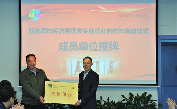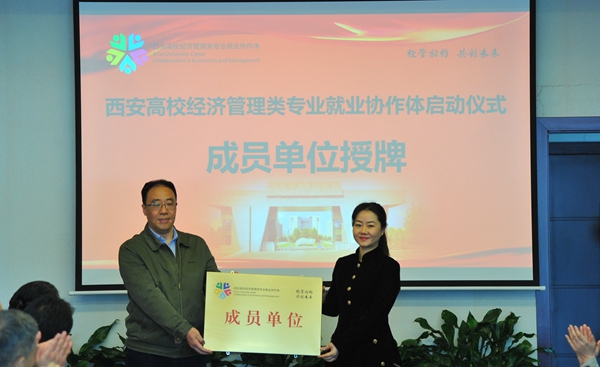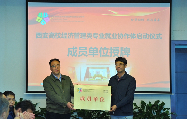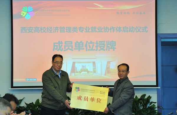 陜西省教育廳高校學(xué)生工作處二級調(diào)研員胡偉安依次為西安高校經(jīng)濟(jì)管理類專業(yè)就業(yè)協(xié)作體成員單位西安石油大學(xué)、西北政法大學(xué)、西安外國語大學(xué)、西安財經(jīng)大學(xué)、西安郵電大學(xué)授牌。