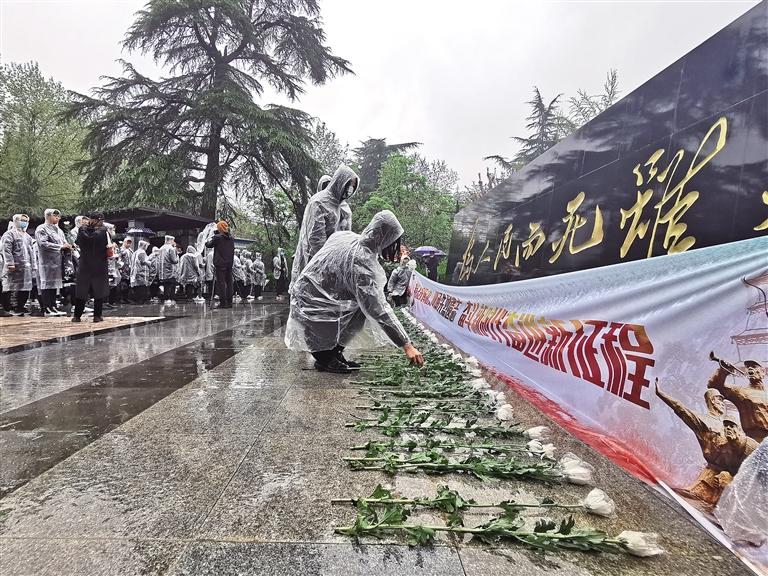 ——43日,陜西省“清明祭英烈”活動在西安烈士陵園舉行,西安石油大學(xué)30余名師生代表參加了活動。天空飄落著雨滴,“明理增信,崇德力行;興國昌邦,弦歌續(xù)唱”的祭辭在烈士陵園中回蕩。在莊嚴(yán)肅穆的氛圍中,參加活動的人們面向烈士紀(jì)念墻默哀、行鞠躬禮,并為革命烈士敬獻(xiàn)鮮花。