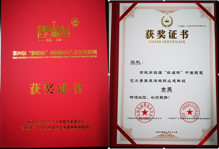 近日,第四屆“敦煌杯”中國琵琶藝術菁英展演落下帷幕,音樂系副主任張帆以具有濃郁京韻大鼓風格的琵琶獨奏曲《弦子韻》以及琵琶傳統(tǒng)大套文曲《塞上曲》兩首曲目在比賽中獲得金獎。由于疫情原因,此次比賽首次采用了云端線上比賽的方式進行。8月初,張帆先以一首琵琶協(xié)奏曲《云想花想》晉級決賽,接著從晉級60人的決賽中脫穎而出,獲得金獎(全國第二名)的好成績。