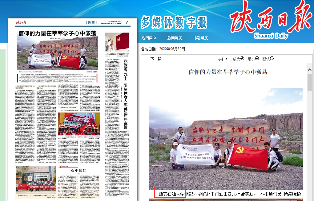 在中國共產(chǎn)黨成立99周年之際,630日,《陜西日報》7版教育版以《信仰的力量在莘莘學(xué)子心中激蕩》為題,對我校黨建工作進(jìn)行了報道。