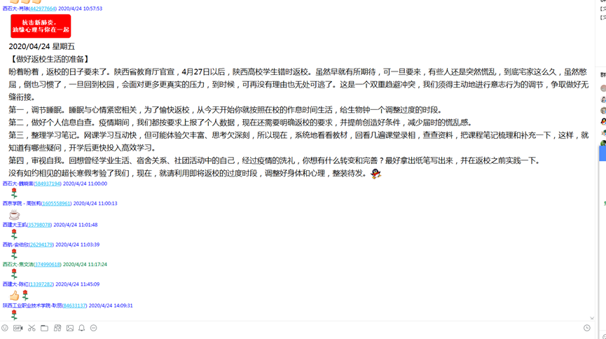 撰寫“兩封書信”,傾情守護凝心聚力。1月31日,學校發(fā)出《給湖北籍西石大學子的一封信》,向身處疫區(qū)中心的學生送去母校的牽掛與撫慰,與湖北籍學生及家人一起抗疫。2月6日,發(fā)布《給陜西高校班級心理委員的倡議書》,并通過陜西省委教育工作委員會轉發(fā)全省各高校,鼓勵廣大學生骨干充分發(fā)揮朋輩優(yōu)勢,攜手互助,建立戰(zhàn)“疫”情境中的心理互助,在國家危機時洋溢青春的力量。