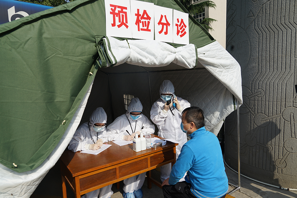 校長李天太下達演練開始命令。在雁塔校區(qū)南門和鄠邑校區(qū)東門,學生入校時按照地面標線,每人間隔一米,有序排好隊伍準備入校,依次進行體溫測量、身份核查、健康碼查驗。入校時一位同學在體溫檢測時發(fā)現(xiàn)異常,在現(xiàn)場工作人員帶領(lǐng)下至臨時留觀區(qū),由校醫(yī)院醫(yī)生仔細詢問其身體狀況,開展體溫復(fù)測并記錄,仍發(fā)現(xiàn)該學生體溫異常,立即啟動應(yīng)急處置預(yù)案,逐級報告疫情防控工作領(lǐng)導小組,安排醫(yī)生和救護車將體溫異常學生送至隔離區(qū)。
