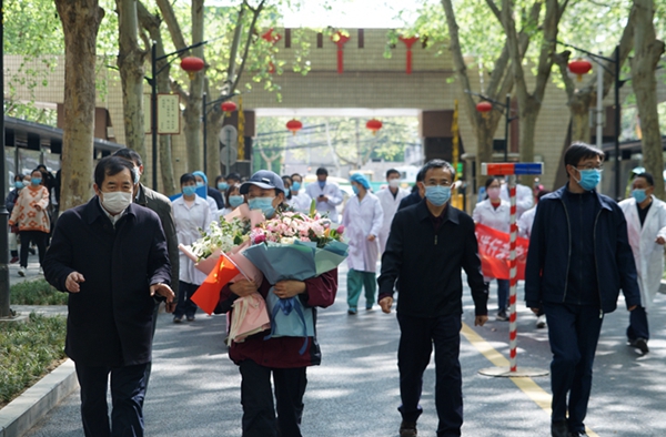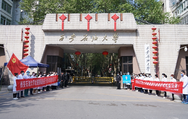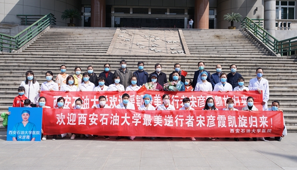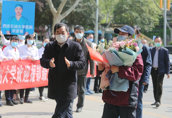 4月8日上午,宋彥霞護(hù)士結(jié)束了14天的隔離觀察期,從隔離觀察點(diǎn)返回學(xué)校。校黨政領(lǐng)導(dǎo)李天太、張木、蘇文甫,相關(guān)部門負(fù)責(zé)人及校醫(yī)院部分職工在雁塔校區(qū)東門迎接宋彥霞護(hù)士。