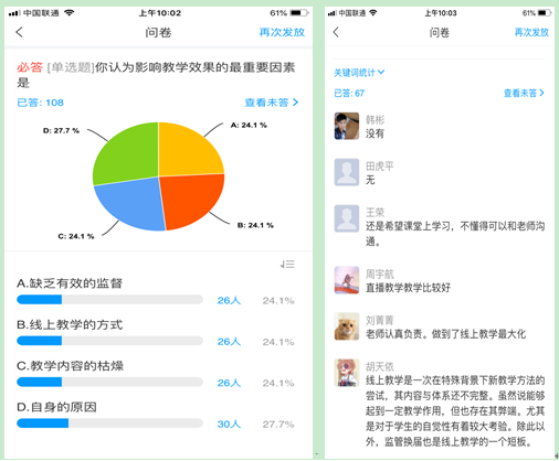 充分調(diào)研,制定并完善教學(xué)方案,為教學(xué)保駕護航。為了更好地開展在線教學(xué),學(xué)院在寒假做了充分調(diào)研,最終采用“學(xué)習(xí)通+騰訊系列平臺”多措并舉的方式,專門建立平臺技術(shù)服務(wù)微信群,及時為教師提供技術(shù)支持;精選慕課資源與課程組集體共建在線課程相結(jié)合,提前做好課程建設(shè);從實際出發(fā),合理制定在線教學(xué)授課計劃,并根據(jù)疫情進展和課程實際情況及時做出調(diào)整;及時了解學(xué)生在學(xué)習(xí)過程中的實際困難,針對特殊情況,采取個性化教學(xué)方案和考核方式,以最大限度確保教學(xué)有序有效。
