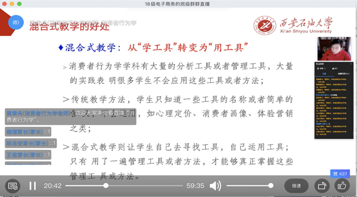 經(jīng)濟學系和管理科學與工程系。為了保障教學效果,經(jīng)濟學系和管科系的老師們也積極踐行“線上”+“線下”的混合式教學方式,將在線教學和傳統(tǒng)教學的優(yōu)勢結合起來,把學習者的學習由淺到深地引向深度學習。老師們提前制定預案,從課程準備、課程資源、課堂教學、師生互動、指導答疑和作業(yè)考評等方面進行教學設計和思考。課程多采用多平臺相結合方式進行開展,如中國mooc課程+釘釘直播教學+釘釘/微信。選用中國mooc平臺的“國家精品課”開展基礎知識學習;通過釘釘直播,開展與章節(jié)內(nèi)容相關的消費者行為學問題討論;通過釘釘班級群/微信群,發(fā)布學習重難點、作業(yè),保障溝通的及時性。這種多平臺相結合的形式,既拓展了學生自主學習能力、鍛煉了學生學以致用的思辨能力,更重要的是培養(yǎng)學生們做“建設者”的意識,學生反饋效果良好。