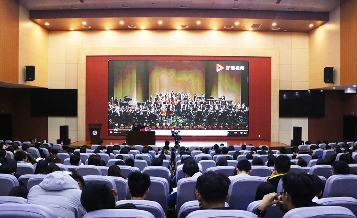 高賀杰老師以一幅圖為引,延伸到聲音。他指出,聲音是傳遞信息的一種基本方式,聲音延伸出音樂,“聰,耳聞而循心通上”,聰(聽)是一個人智慧的標(biāo)志。隨后,高老師列舉不同領(lǐng)域名家實例詮釋音樂,并為同學(xué)們闡釋了怎樣聽音樂以及聽音樂的禮儀。他強調(diào),音樂是需要想象力的,因為音樂的無造型性、無語義性,所以聽聲聯(lián)想畫面能更深層次的體會其內(nèi)涵。最后,高老師為同學(xué)們播放并解析著名音樂家柴科夫斯基的《1812序曲》,使同學(xué)們感受到交響樂的魅力。