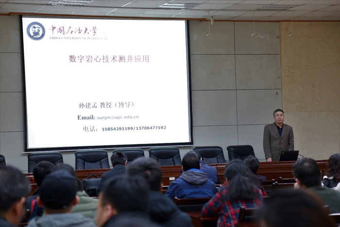 聘任儀式結(jié)束后,中國(guó)石油大學(xué)(華東)孫建孟教授以“數(shù)字巖心技術(shù)在測(cè)井中的應(yīng)用”為題,在第三會(huì)議室為我校師生作了學(xué)術(shù)報(bào)告。孫建孟教授從數(shù)字巖心建模、巖石物理屬性模擬等方面對(duì)數(shù)字巖心技術(shù)進(jìn)行了介紹,指出數(shù)字巖心技術(shù)與常規(guī)巖石物理實(shí)驗(yàn)相比存在的優(yōu)勢(shì),是研究微觀因素對(duì)巖石物理屬性影響的重要手段,同時(shí)展望了數(shù)字巖心技術(shù)在地質(zhì)、地震、巖土工程等學(xué)科中的應(yīng)用前景。