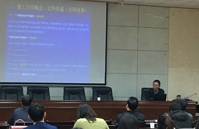 專題講座上,徐雷教授圍繞建筑工程合同管理中的合同概述、施工合同概念文件組成、施工合同的特點(diǎn)、施工合同風(fēng)險識別障礙、施工合同索賠問題以及施工合同管理方法建議等六個方面,進(jìn)行了詳細(xì)地講解。講座中穿插了大量的實(shí)際案例,具有較強(qiáng)的針對性和實(shí)踐性。講座結(jié)束后與會人員積極向徐教授提問請教,現(xiàn)場氣氛熱烈。