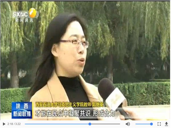 11月4日下午,陜西廣播電視臺(tái)記者對我校學(xué)習(xí)十九屆四中全會(huì)精神及開展“不忘初心、牢記使命”主題教育情況進(jìn)行了拍攝報(bào)道,采訪了校黨委書記賽云秀、馬克思主義學(xué)院教師郭艷英。節(jié)目以《讓黨的十九屆四中全會(huì)精神落地生根,為“中國之治”貢獻(xiàn)智慧和力量》為題,分別在陜西電視臺(tái)《陜西新聞聯(lián)播》、陜西廣播電臺(tái)《全省新聞聯(lián)播》中播出。