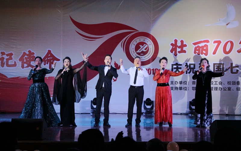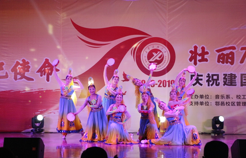 為深入開(kāi)展“不忘初心、牢記使命”主題教育,10月26日晚,由音樂(lè)系、校工會(huì)、校團(tuán)委主辦,鄠邑校區(qū)管理辦公室、組織部、宣傳部、學(xué)生工作部支持的“不忘初心、牢記使命,壯麗70年、奮進(jìn)新時(shí)代”慶祝新中國(guó)成立七十周年文藝展演在鄠邑校區(qū)騰輝大學(xué)生活動(dòng)中心舉行。校黨委副書記雷西合、副校長(zhǎng)楊戰(zhàn)社、副校長(zhǎng)程永清出席活動(dòng)。相關(guān)部門負(fù)責(zé)人及鄠邑校區(qū)600余名學(xué)生觀看了晚會(huì)。
