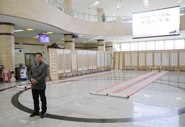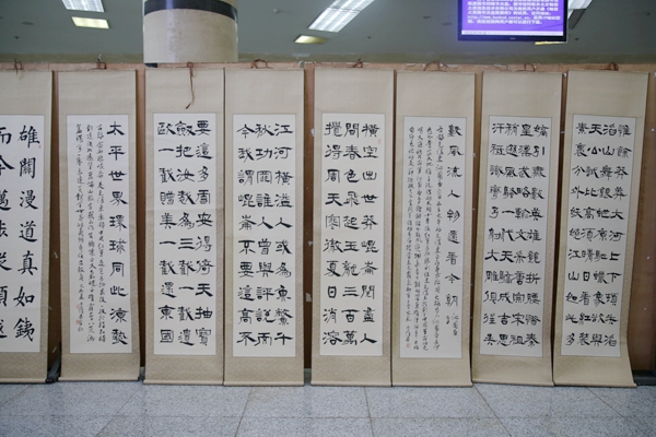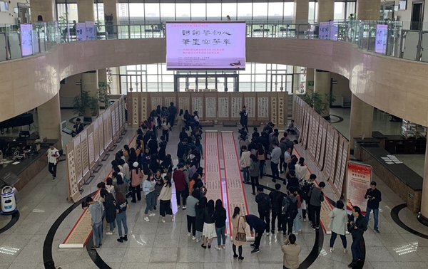 該展覽共展出人文學(xué)院教師盧強(qiáng)用一年時間創(chuàng)作完成的,以真、行、草、隸等多種書體書寫的毛澤東詩詞書法作品50余幅,內(nèi)容豐富,形式多樣。其中,長130米、寬0.8米的書法長卷,以年代為序,精選了毛澤東1923年至1965年間各個時期的經(jīng)典詩詞42首,以工穩(wěn)的漢隸書寫,同時在每一首詩詞后以行書書寫個人的鑒賞學(xué)習(xí)體會,彰顯了毛澤東的心路歷程和人格魅力,深受在場師生的關(guān)注和好評。